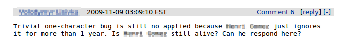 Some names have been blurred to protect the innocent (only if you're too lazy to click the source link up there though). In any case, given that it is a "major" bug (as is specified in its severity), I thought that Core developers would pay more attention to it.